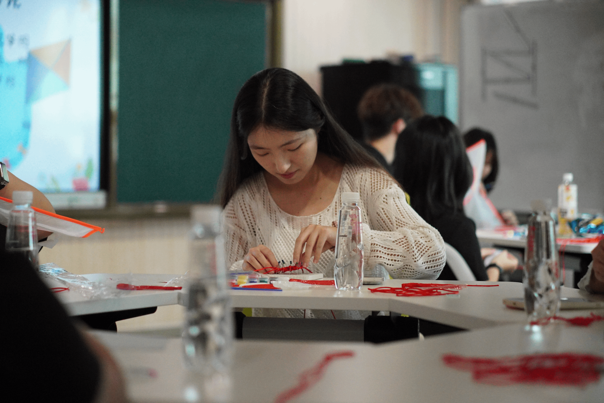活动伊始,“结”艺传承环节便吸引了众多同学的目光。在视频教学的指导下,同学们全神贯注地尝试编织中国结。尽管编织过程复杂,但在同学们的专注努力下,一根根丝线相互交织,不一会儿,一个个精美的中国结便在同学们的手中诞生。大家一边编织,一边交流心得,分享着传统文化带来的乐趣,现场洋溢着浓厚的文化氛围与温馨情谊。这一环节不仅让同学们感受到了传统文化的魅力,也增进了同学们之间的交流与合作。