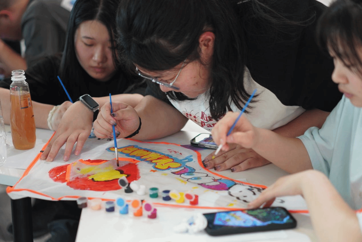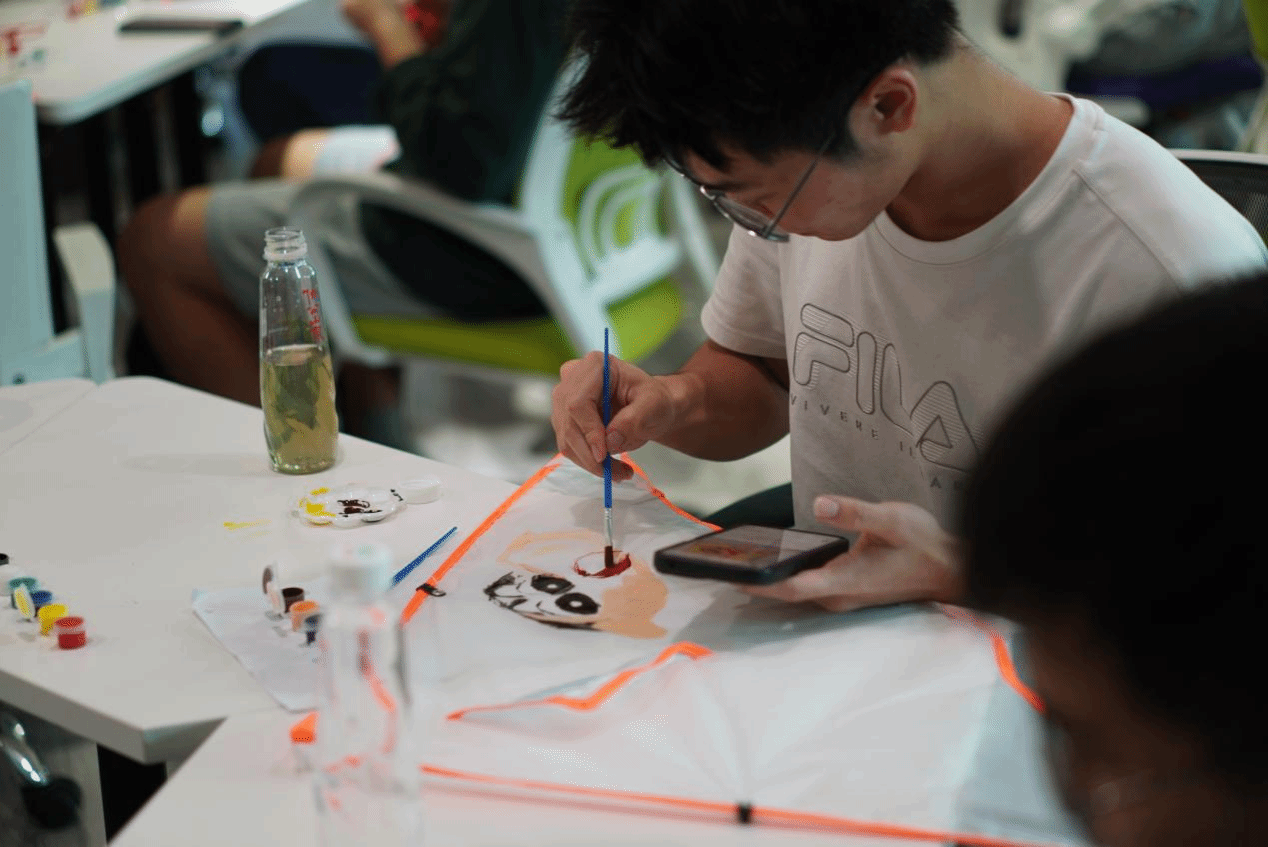 “以风为墨,筝写春光”环节更是激发了同学们的无限创意。活动为参与者提供了空白风筝骨架、风筝纸、颜料、画笔、彩带等制作材料,同学们自由发挥创意,将个人想法、创意融入风筝图案之中,让风筝承载着同学们的心意与愿景。每个小组的风筝作品都独一无二,充满了奇思妙想。