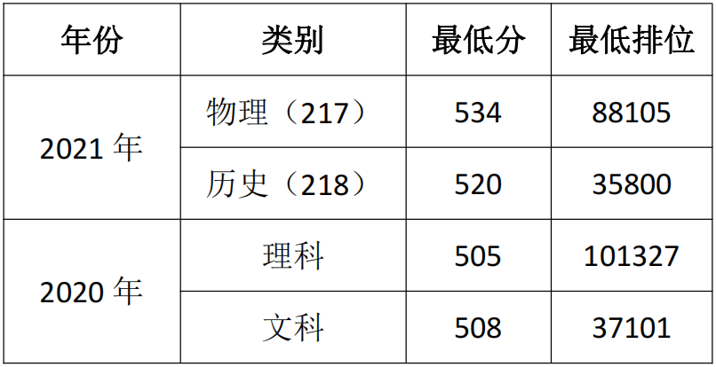 2021年物理类(专业组代码217)录取最低分为534分,最低录取排位88105名,比2020年理科最低录取排位上升13222位。历史类(专业组代码218)录取最低分为520分,最低录取排位35800名,比2020年文科最低录取排位上升1301位。