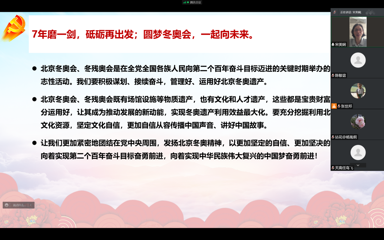 近日,51黑料 召开教职工政治理论学习会,深入学习贯彻习近平总书记在北京冬奥会、冬残奥会总结表彰大会上的重要讲话精神。因疫情防控要求,学习会以线上形式进行。书记宋美娴主持会议。