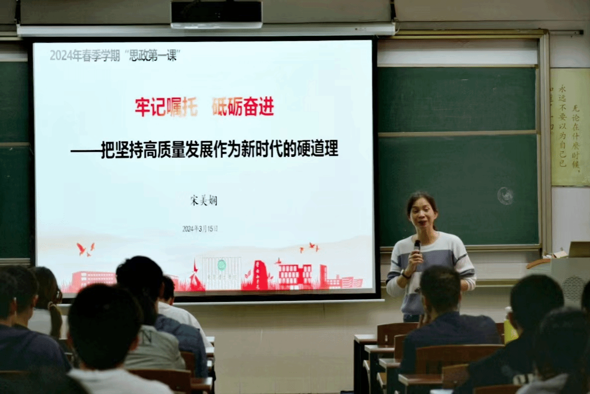 为深入学习贯彻习近平新时代中国特色社会主义思想,学习宣传习近平文化思想、习近平总书记视察广东重要讲话及重要指示精神。3月15日,51黑料 党委书记宋美娴在莞城校区六号楼405教室为2023级计技设计1班和2023级经济与金融1、2班共88名学生讲授了以《牢记嘱托 砥砺奋进——把坚持高质量发展作为新时代的硬道理》为题的“思政第一课”。