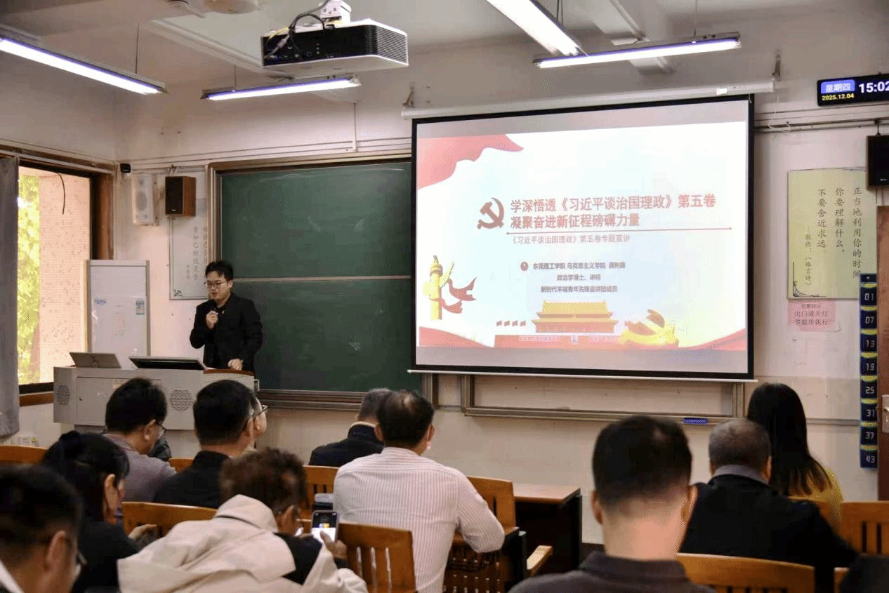 党委在莞城校区教学楼6202教室开展专题学习《习近平谈治国理政》第五卷暨全体教职工政治理论学习会。学院邀请马克思主义学院龚利鑫博士以题为“学深悟透《习近平谈治国理政》第五卷,凝聚奋进新征程磅礴力量”作专题辅导。学院全体教职工、师生党员和入党积极分子等参加了专题学习,会议由学院党委书记宋美娴主持。