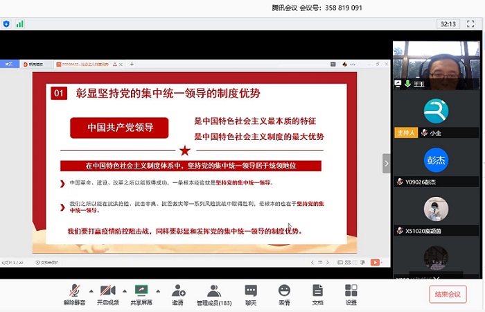 党支部通过腾讯会议APP线上组织开展“在疫情大考中彰显中国特色社会主义制度优势”主题党课,支部副书记王玉主讲,师生党员、积极分子约180余人参加。