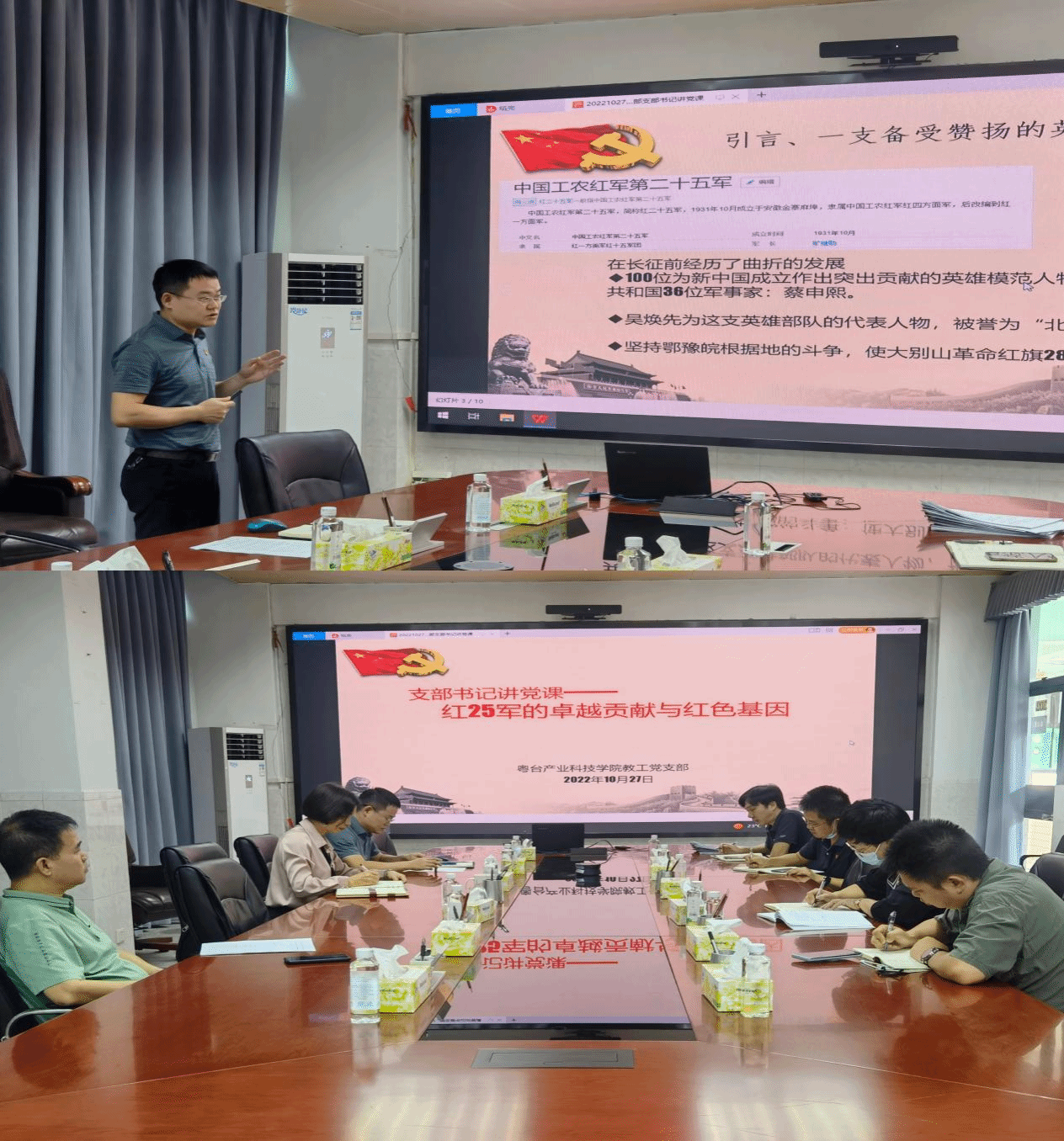 教工党支部在莞城校区实验楼302会议室开展了以“红25军的卓越贡献与红色基因”为主题党课活动,本次党课由党支部书记谢春晓主讲,教工党支部全体党员参加。