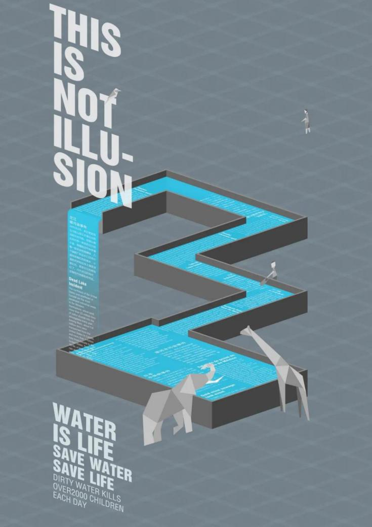 受到M.C.Escher作品的启发,海报以一个因视错觉而形成循环的水道为主体,表达了水资源污染者最终将会自食其果并危害其他生命。