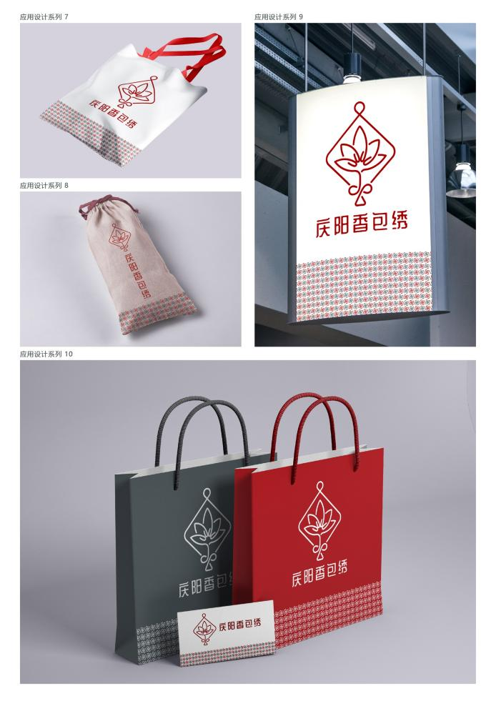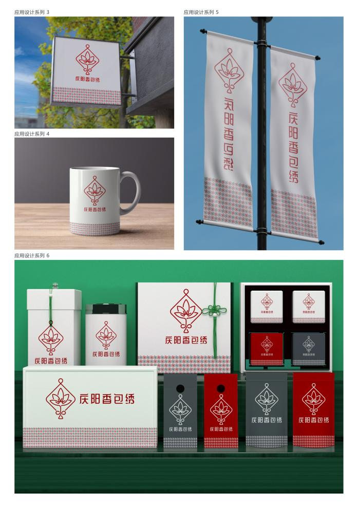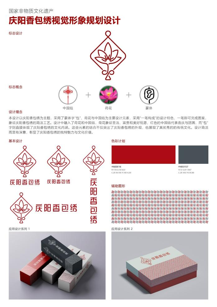 本次获奖作品以甘肃省非物质文化遗产庆阳香包绣为主题,采用了篆体字“包”、荷花与中国结为主要设计元素,以及"一笔构成"的设计特色,一笔完成图案象征庆阳香包绣的简洁工艺。设计中融入了荷花和中国结,荷花象征圣洁、富贵和美好祝愿,红色的中国结代表喜庆与团圆,而“包”字则直接体现了庆阳香包绣的文化内涵。这些元素的结合不仅突出了庆阳香包绣的外观,也展现了其优秀的传统文化。设计简洁而富有深意,彰显了庆阳香包绣的独特魅力与文化价值。