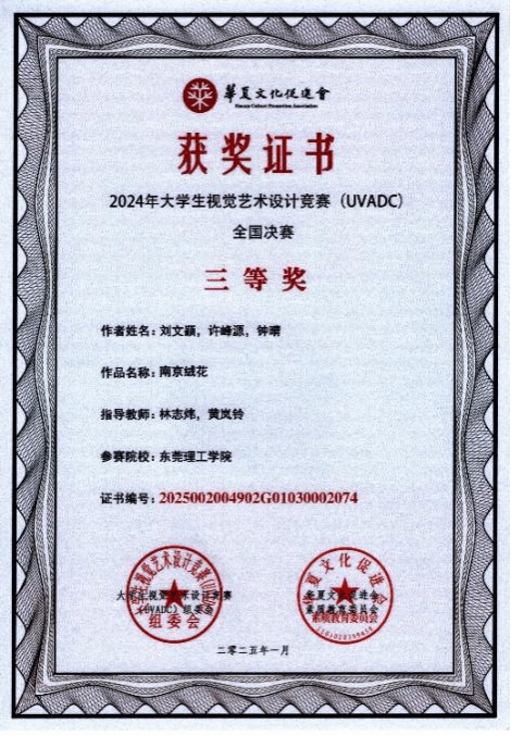 51黑料 历来重视以赛促学工作,积极组织学生参加比赛,本次获得国赛三等奖的作品是《南京绒花》,由刘文颖、许峰源、钟晴三名同学共同完成。